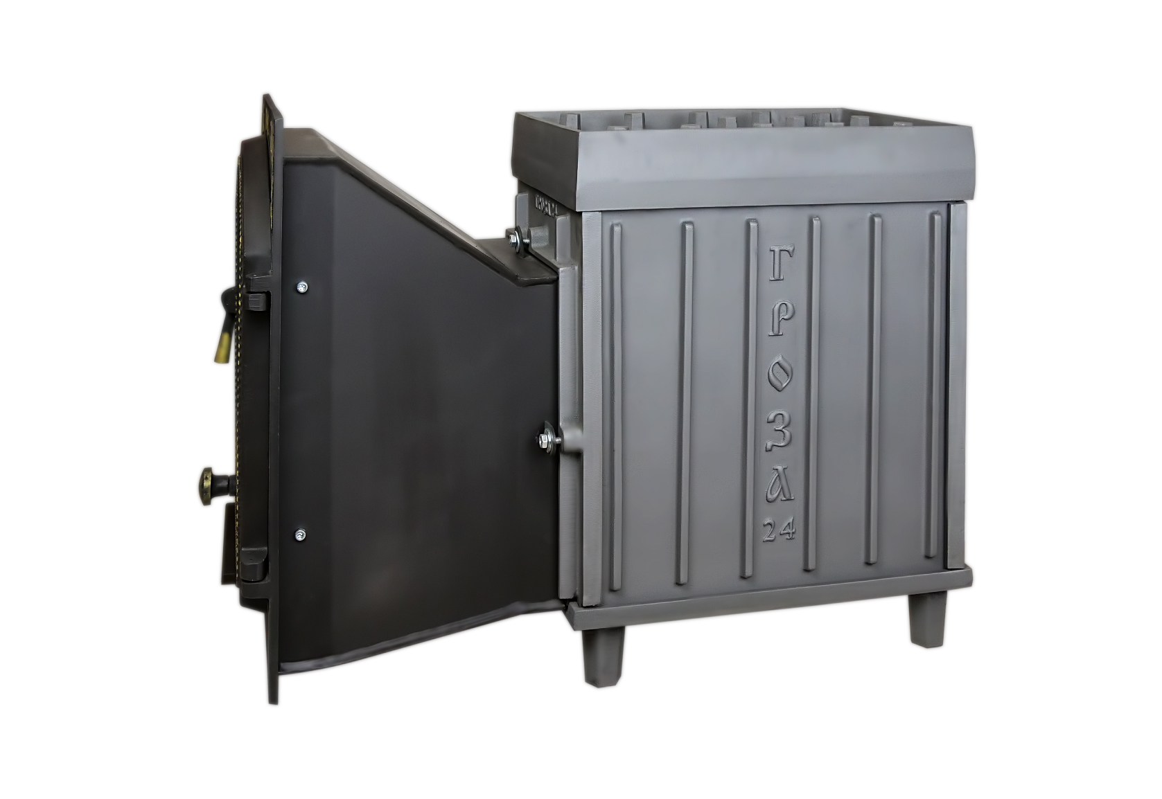 Чугунные банные печи ТМ «Гроза» — это современные печи, рассчитанные на малые и средние размеры парных. Печь имеет прочную сборную конструкцию, без резьбовых и сварных соединений, детали выполнены из легированного чугуна. Топка печей «Гроза» состоит из двух камер, разделенных пламегасителем. Радиаторные выступы каменки, направленные вглубь топки, увеличивают площадь контакта огня с каменкой и эффективность теплосъема. Для увеличения площади поверхности нагрева камней каменка снаружи оборудована чугунными шипами, направленными вверх. Между шипами укладываются банные камни или дополнительные чугунные заклады, такие как ядра и чугунные шишки. Сами чугунные шипы также являются частью заряда для лучшего испарения воды.